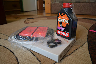 Po zestawie startowym, jaki każdy nowo zakupiony pojazd powinien przejść przyszedł czas na kolejny etap. W czasie dokonywania zakupu wyczuliśmy lekkie stuki w jak się nam wtedy wydawało przednim zawieszeniu. Werdykt padł na uszczelniacze, których poprzedni właściciel nie wymienił podczas zmiany oleju. Wybór padł na Motula o gęstości 20 W, który był dużo gęstszy niż serynie "lany" przez Suzuki 10W. Mimo braku większych wad w tym modelu motocykla to przednie zawieszenie jest chyba najsłabszym elementem. Można to korygować lejąc do lag gęstszy olej, zmieniając sprężyny, albo zaadaptować przód od innego motocykla. Póki co olej musi wystarczyć.
